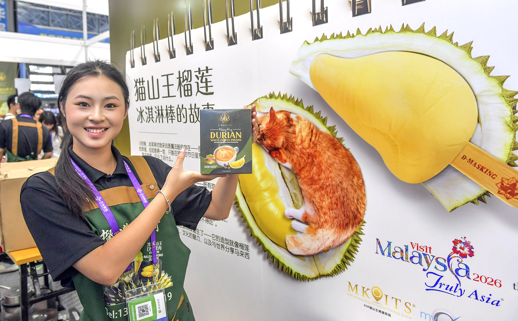 A staff member showcases a Malaysian durian product at the 22nd China-ASEAN Expo in the southern city of Nanning on Sept 21, 2025. (PENG HUAN / FOR CHINA DAILY)