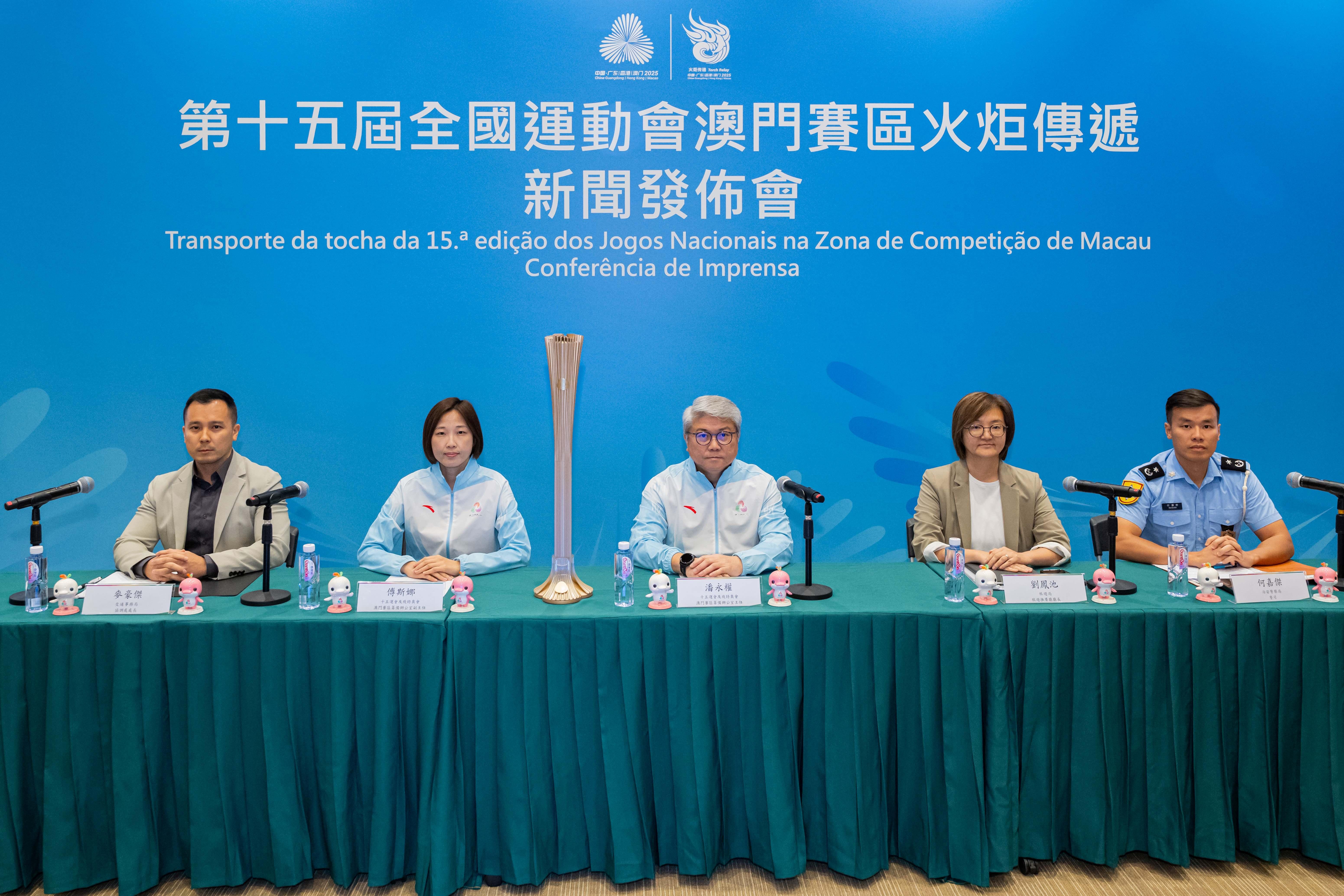 In this photo released by the preparatory office of the Macao events of China's 15th National Games, office director Pun Weng-kun (center) and other officials attend a press conference on the torch relay in Macao on Oct 28, 2025.
