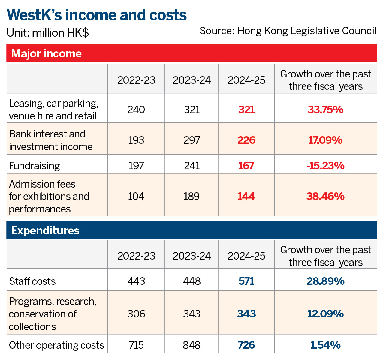 By the 2022-23 fiscal year, the major facilities from the first development phase, and the HKPM, had been completed, generating HK$746 million in revenue annually. But the arts hub’s expenditure surged to HK$1.46 billion, resulting in a deficit of HK$718 million. The annual income-expenditure gap narrowed to HK$578 million a year later, but rebounded to HK$769 million in the 2024-25 fiscal year.