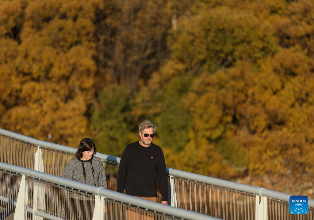 People enjoy walking near Lake Tekapo of New Zealand's South Island, on April 26, 2025. (PHOTO / XINHUA)