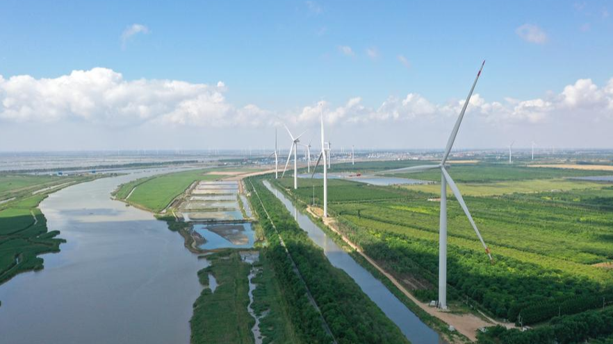 An aerial drone photo taken on June 6, 2024 shows the wind power equipment at a low (zero) carbon-dioxide emission industrial park in Sheyang, Yancheng, East China's Jiangsu province. (PHOTO / XINHUA)