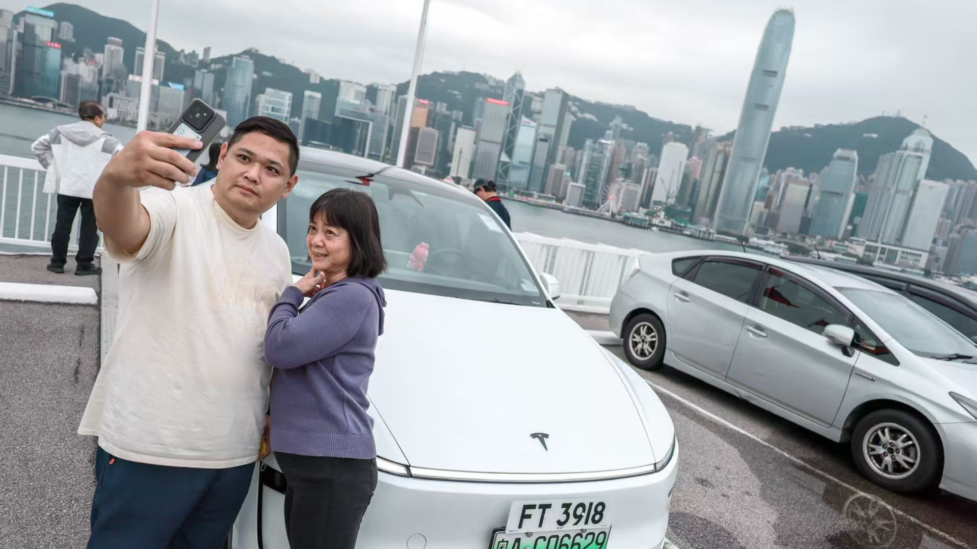 A couple from Guangdong province poses for a selfie with their vehicle on rooftop car park of Harbour City in Tsim Sha Tsui on Dec 23, 2025. (ANDY CHONG / CHINA DAILY)
