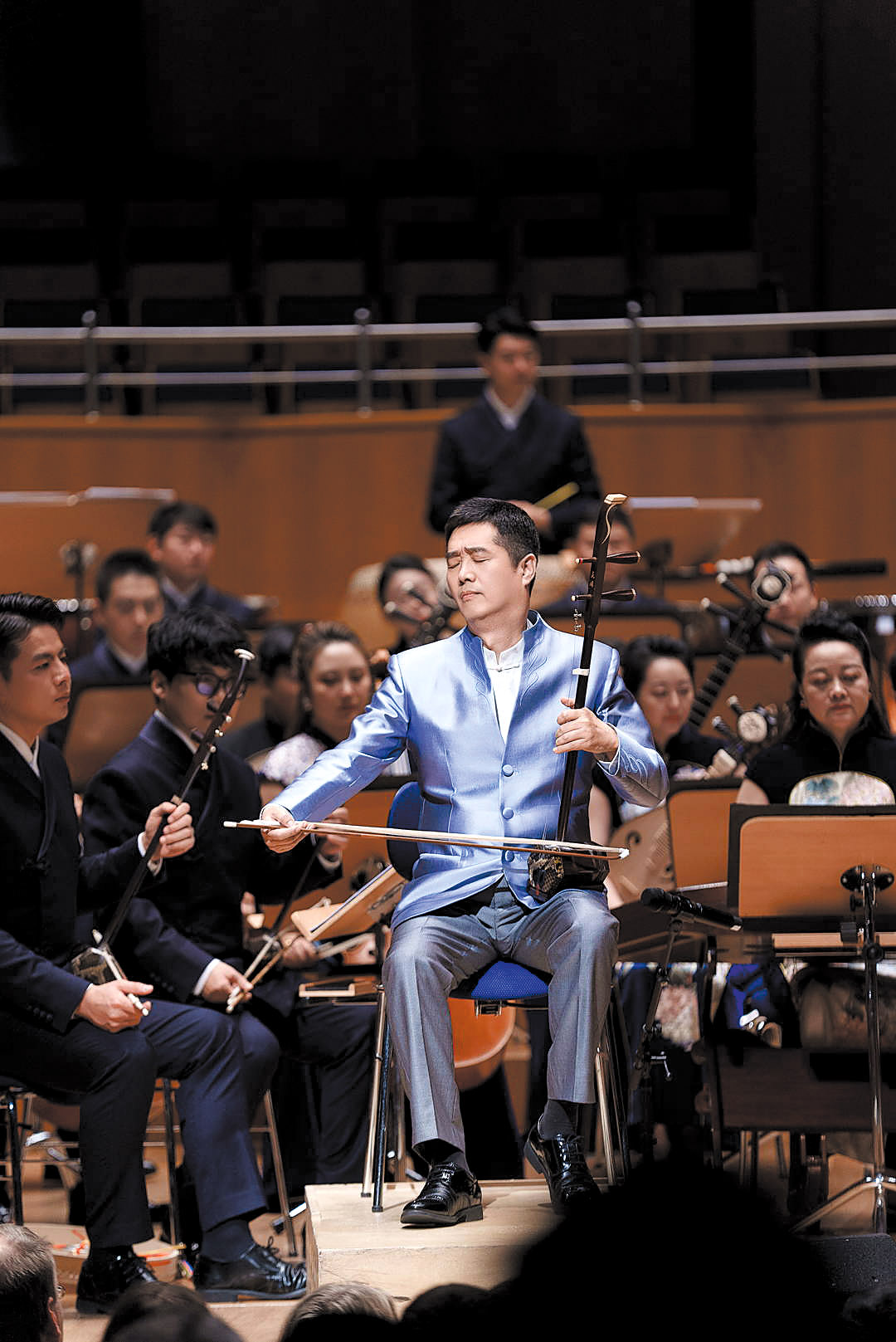 Tang Feng, erhu player and president of the China National Traditional Orchestra, performs at the Tonhalle Zurich, a historical concert hall in Zurich, Switzerland, in 2024. (PROVIDED TO CHINA DAILY)
