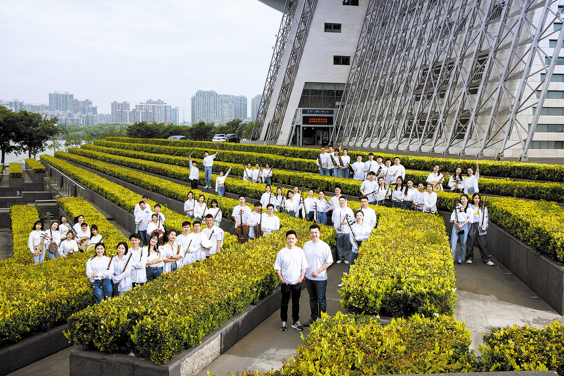 The Wuxi Chinese Orchestra poses outside the Wuxi Grand Theatre. (PROVIDED TO CHINA DAILY)