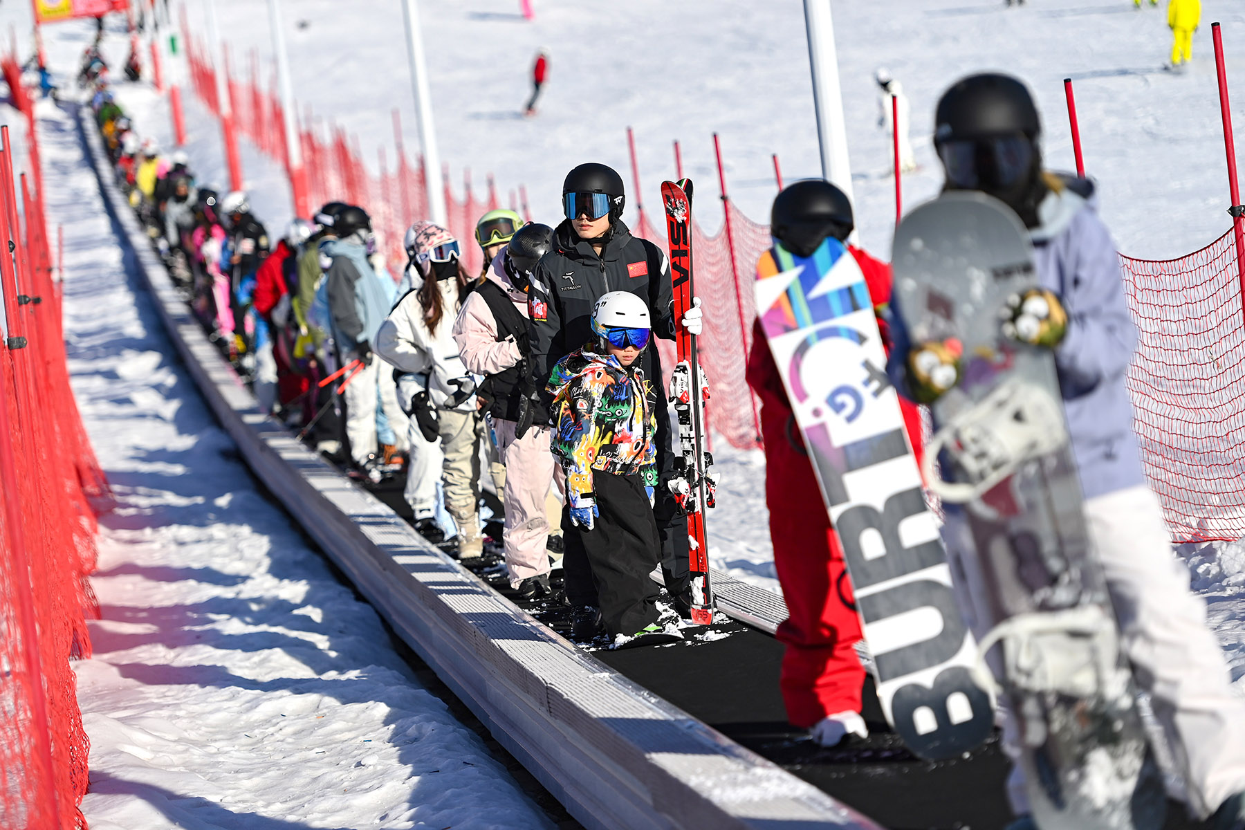 Ski enthusiasts ride a magic carpet lift at a resort in Qingzhou, Shandong province, on Jan 11, 2026. (WANG JILIN / FOR CHINA DAILY)