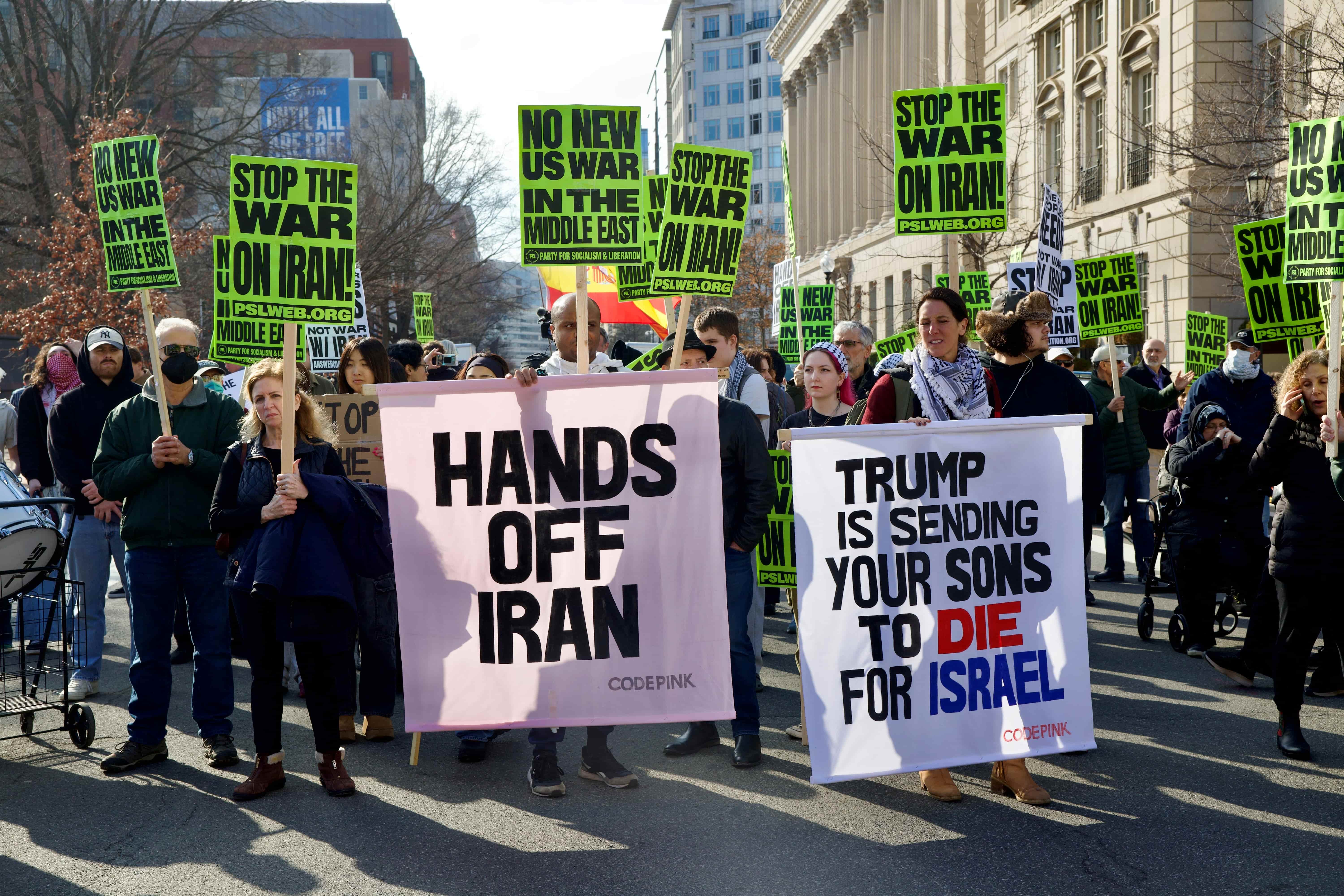 In New York City's Manhattan, a crowd of hundreds gathered at Union Square on Saturday afternoon, chanting slogans such as "Biggest Threat in the World Today: Donald Trump and the USA" and "Trump Says More War, We Say No More," and carrying signs that read "Hands off Iran," "No New US War in the Middle East," and "Money for People's Needs, Not War with Iran."
