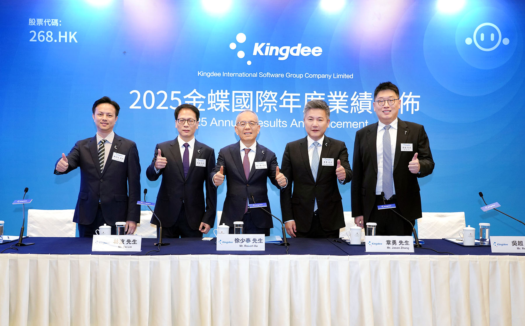 Kingdee Chairman and CEO Robert Xu (center) celebrates with colleagues on March 18, 2026 in Hong Kong after the company's fiscal year 2025 annual results announcement. (PROVIDED TO CHINA DAILY)