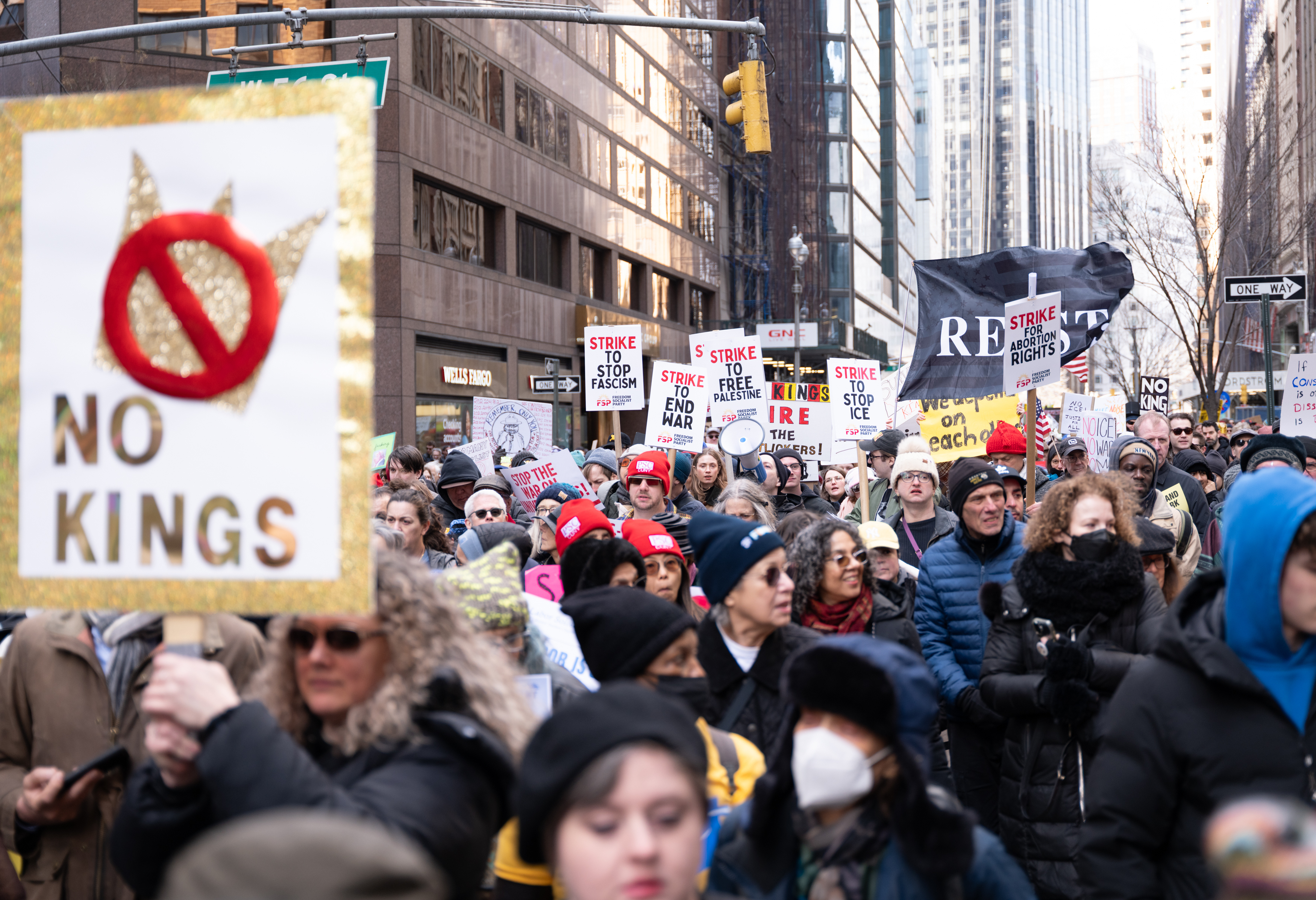 In New York City, protests took place across all five boroughs of the Bronx, Brooklyn, Manhattan, Queens and Staten Island. In Manhattan, tens of thousands of protesters marched along Seventh Avenue on Saturday afternoon, stretching more than 10 blocks, chanting slogans and carrying signs reading "No ICE," "NO Kings," and "No Wars."