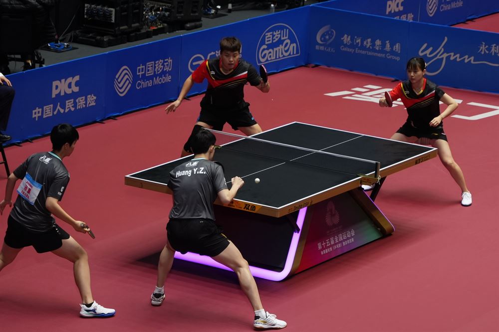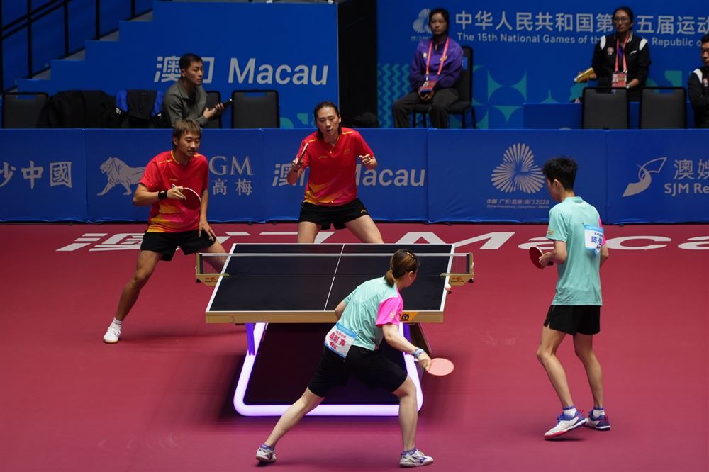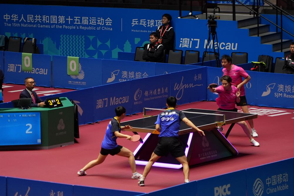 A competition of the mixed doubles table tennis takes place during the 15th National Games at the Galaxy Arena in Macao on Nov 7, 2025. (FLORENCE LI / CHINA DAILY)