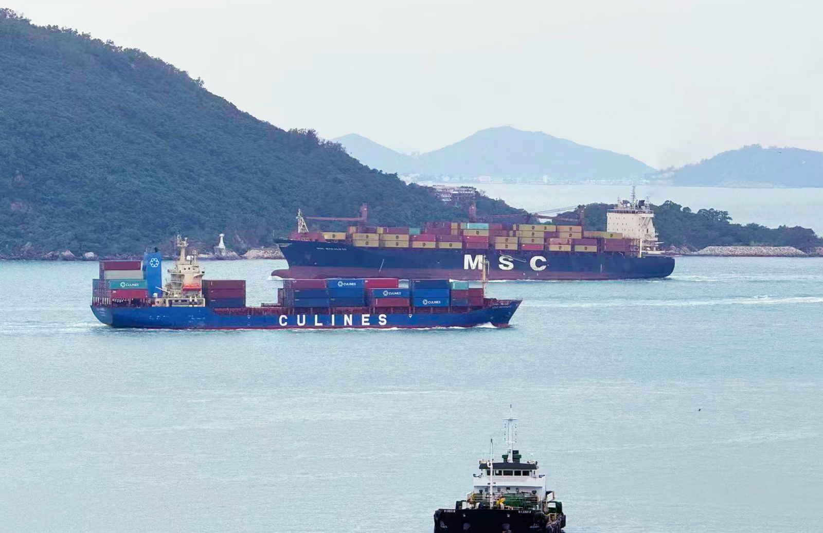This Nov 13, 2025, photo shows two cargo ships moving along a route in the South China Sea off Hong Kong Island. (SHAMIM ASHRAF / CHINA DAILY)