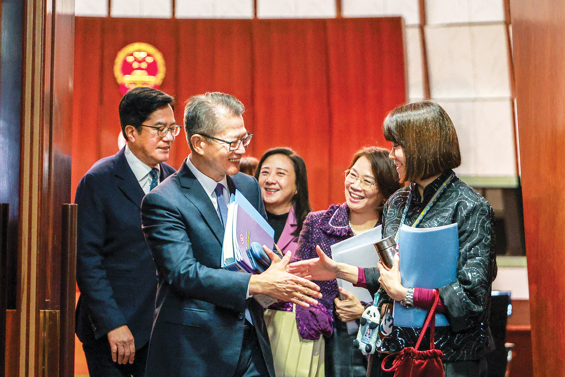 Hong Kong Financial Secretary Paul Chan Mo-po (second from left) greets lawmakers after delivering the 2026-27 Budget address on Feb 25, 2026. (ANDY CHONG / CHINA DAILY)